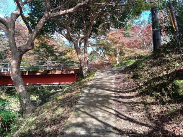 このように谷のそばまで降りることができる歩道もあります。紅葉は、駐車場から市街地方向に向かう車道からも見られますが、道幅が狭く、交通量も多いので注意が必要です。