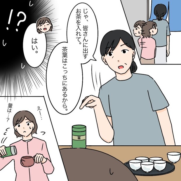 ユウタさんから法事の件を聞いたトモコさんは、結婚挨拶のときの義母の言動を思い返し「これ以上印象が悪くなるといけないから行くよ」と参列を決意。そして法事当日、義実家に到着するや否や義母はトモコさんに手伝うように言いキッチンへ連れていきました。戸惑うトモコさんにお構いなしに義母は親戚の皆さんに出すお茶を淹れるよう指示。一度にたくさんのお茶を淹れたことがなかったトモコさんは戸惑ってしまいます。