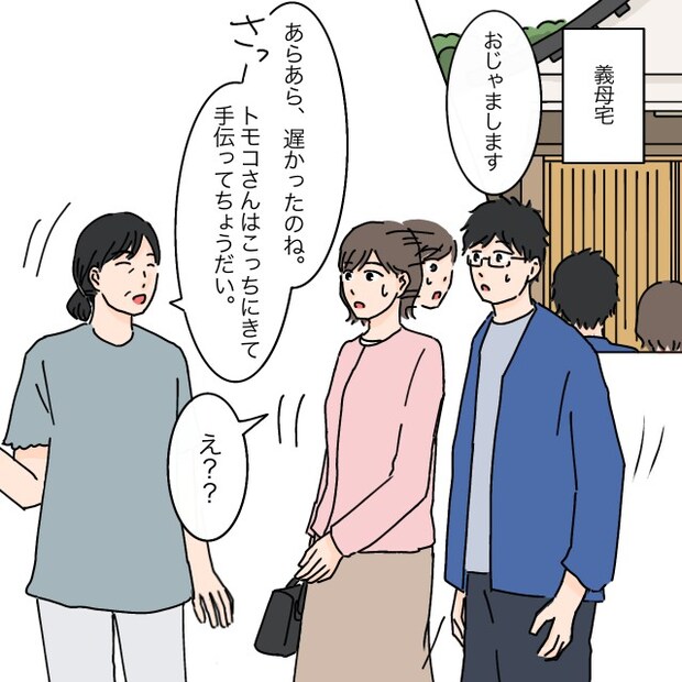 そして義実家に到着。「おじゃまします」と緊張しながら玄関に入るや否や「あらあら、遅かったのね」と言いながら出てきた義母に「さっ、トモコさんはこっちに来て手伝ってちょうだい」と言われました。突然のことに「え??」と戸惑っていると、