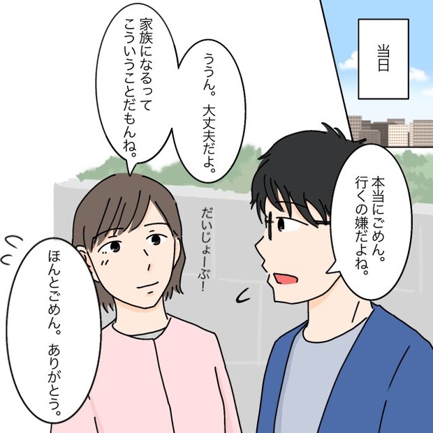 法事当日。「本当にごめん。行くの嫌だよね」と気遣ってくれる夫の気持ちが嬉しくて「ううん。大丈夫だよ。家族になるってこういうことだもんね」と笑顔で答えると「ほんとごめん。ありがとう」と夫は言ってくれました。