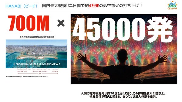 メインコンテンツとなる花火ショーでは、2日間合計で“限界突破の45,000発”を打ち上げ。700メートル先まで連なる光のグラデーションが海と空を一体化させ、観る者を“光の中”へと誘う。