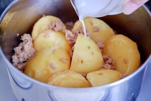 2. 鍋にごま油を熱し、ひき肉を炒めたら1のじゃがいもを追加します。調味料とひたひたの水を入れ、落しぶたをして煮込みます。