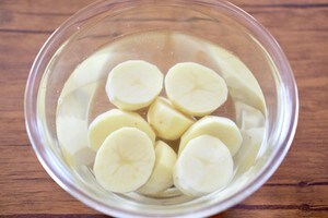 1. じゃがいもは皮をむいて半分に切り、水にさらしておきます。