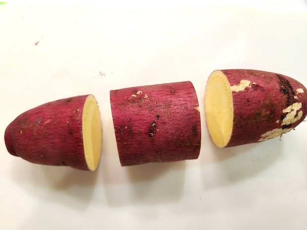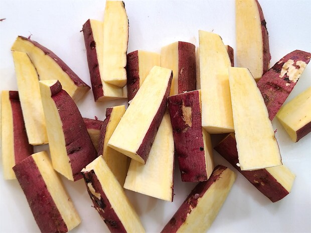 1. 洗ったさつまいもを皮付きのまま1/3くらいの大きさにカットしたあと、棒状に切ります。