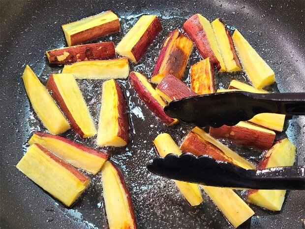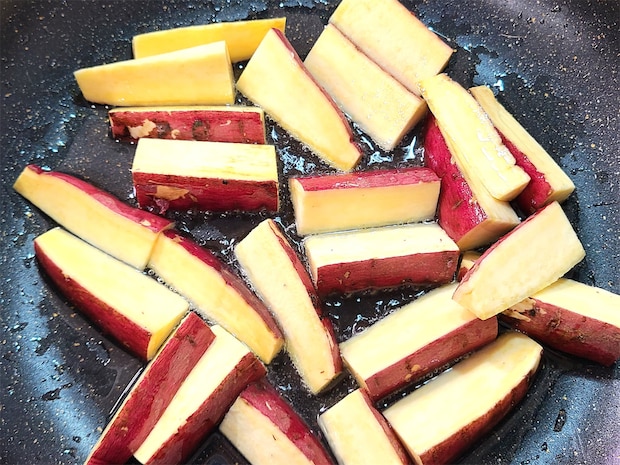 2. フライパンにココナッツオイルを入れて強火で熱し、じっくりとさつまいもを焼きます。パチパチと音がし始めたら中火にしてください。