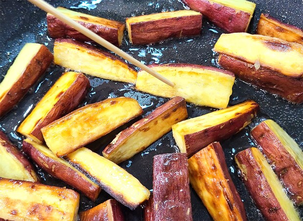 3. フタを開けてさつまいもをひっくり返し、またフタをして3分蒸し焼きにします。