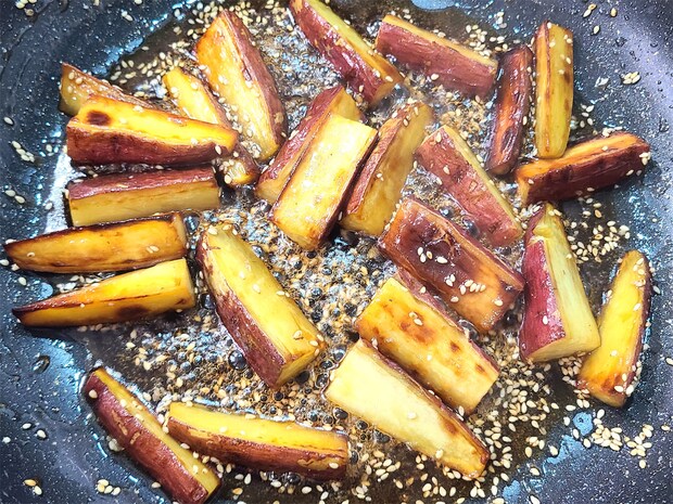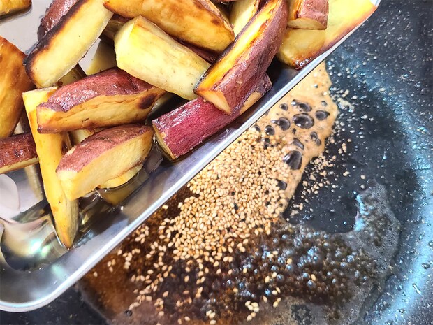 ポイントは、砂糖をあまり煮詰めないことだそうです。わたしがイメージする大学芋は「カラメルでコーティングされていて、つやつやとテカリがあって、食感はカリカリ」というものでしたが、今回は三國シェフのアドバイス通り、あまり煮詰めないうちにさつまいもと合わせました。すると、外はほどよくカリカリで、中はさつまいものホクホク感がしっかり生かされて、いつもよりとっても食べやすい!なるほど~と感心してしまいました♪