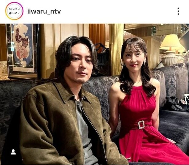 この日、「良いこと悪いこと」公式Instagramが更新。「ニコちゃん(松井玲奈)のお店に行ったキング(間宮祥太朗) ニコちゃんのドレス姿とってもキレイだった 実は、6種類くらい着てました」などのコメントとともに、間宮と松井のツーショット写真を投稿した。
