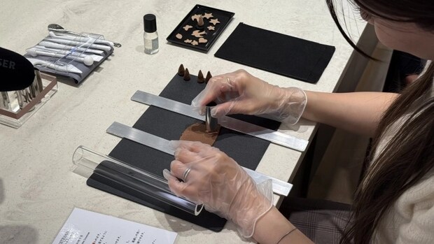 まずはボウルに、お香の元となるタブノキの粉末を入れ、先ほど選んだ「ピュアリネン」のオイルを15滴垂らし、しっかりと撹拌(かくはん)させます。「ホワイトムスクの良い香りがして、癒されます〜」と、かえでさん。