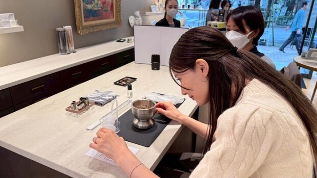 ワークショップでは、店内に並ぶ香りアイテムからお気に入りを選び、自分だけのお香をつくることができるんです。今回かえでさんは、ESTEBANのクラシックラインから香りを選ぶことに。
