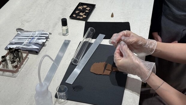 まずはボウルに、お香の元となるタブノキの粉末を入れ、先ほど選んだ「ピュアリネン」のオイルを15滴垂らし、しっかりと撹拌(かくはん)させます。「ホワイトムスクの良い香りがして、癒されます〜」と、かえでさん。