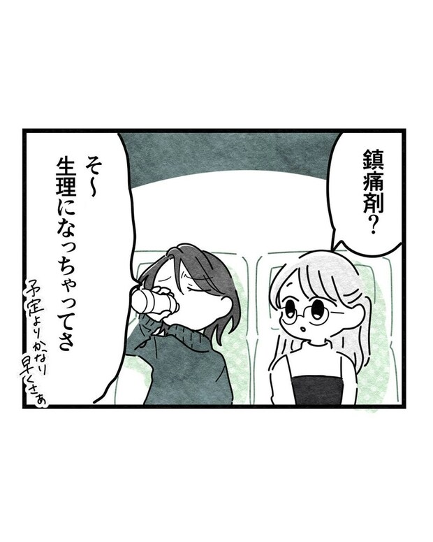 前回、遅刻したふうかさんのせいで旅行の計画がたてられずだったので、行きの新幹線で計画をたてる2人。ちょうど生理になってしまったさほさん、鎮痛剤を飲みながらの旅行です。