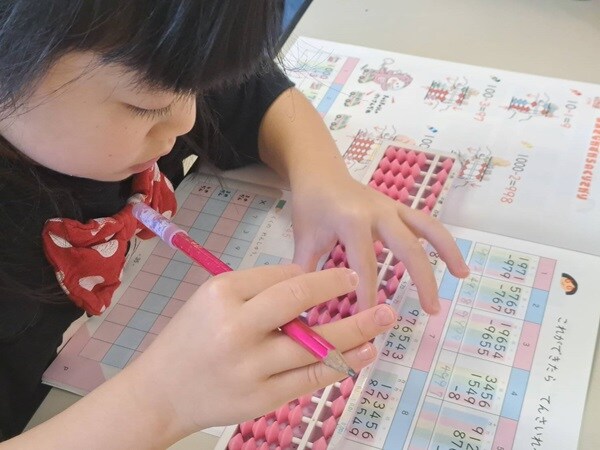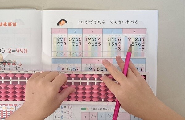 「両手そろばん」は、右手のみで操作する通常のそろばんとは異なり、左右の手で異なる珠(たま)を操作する。左右の手をバランスよく使うことで脳が活性化されるため、計算スピードは片手操作の2倍以上。自然と頭の中で珠の動きをイメージするようになり、暗算能力が大きく向上するという。