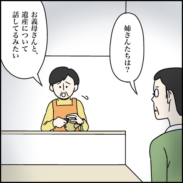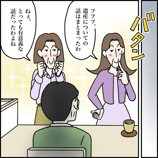「フフフ、遺産についての話はまとまったわ」「ねぇ、とっても有意義な話だったわよね」と2人ともウキウキ。そんな姉たちを夫が黙って見つめていると、