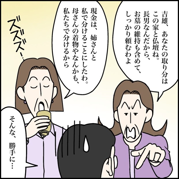 「吉雄、あなたの取り分はこの家と仏壇ね。長男なんだから、お墓の維持も含めてしっかり頼むわよ」吉子さんがそう言うと、「現金は、姉さんと私で分けることにしたわ。母さんの着物やなんかも私たちで分けるから」吉美さんがお茶をすすりながらそう言い、「そんな、勝手に・・」と夫は動揺。