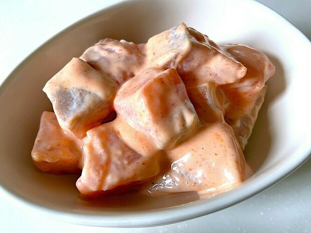 タイ発祥の辛いソース、シラチャーソースとマヨネーズを混ぜたものに角切りにしたサーモンを絡めるだけ。