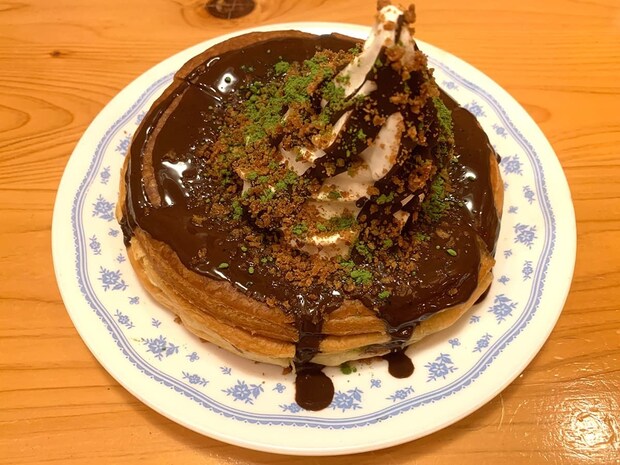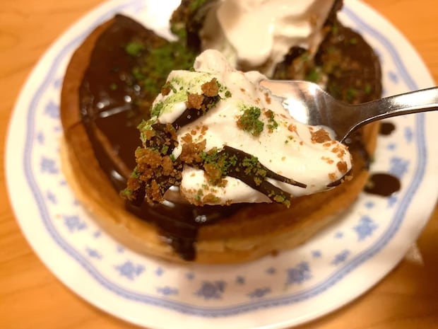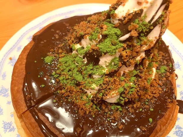 通常のシロノワールはデニッシュパンの上にソフトクリーム、そして付属のシロップをかけて食べますが、本品はソフトクリーム・チョコソース・クランチ・宇治抹茶が豪快にトッピングされています。宇治抹茶が彩りを添えており、和の上品さも感じられますよね♪