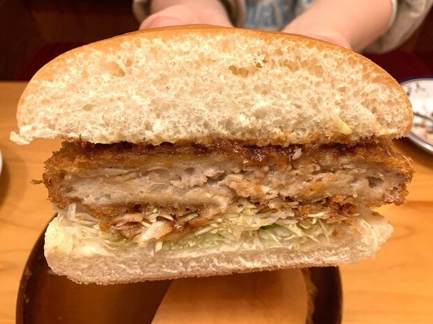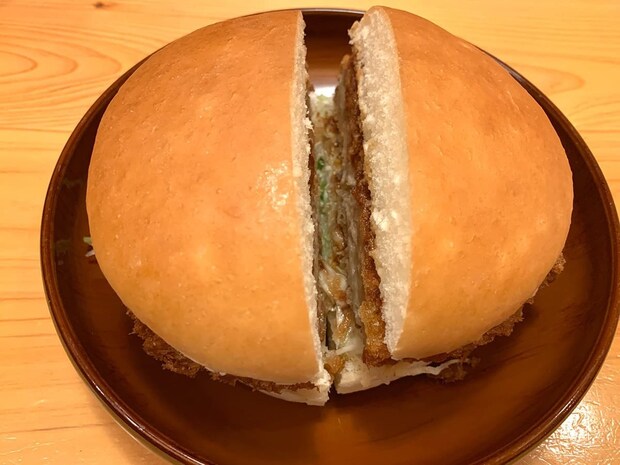 カットされた断面をチェックしてみると、バンズからはみ出さんばかりの分厚いメンチカツが目を引きます!断面からもジューシーさが感じられ、「食べごたえありそう!」と思わせてくれます♪