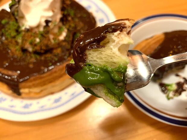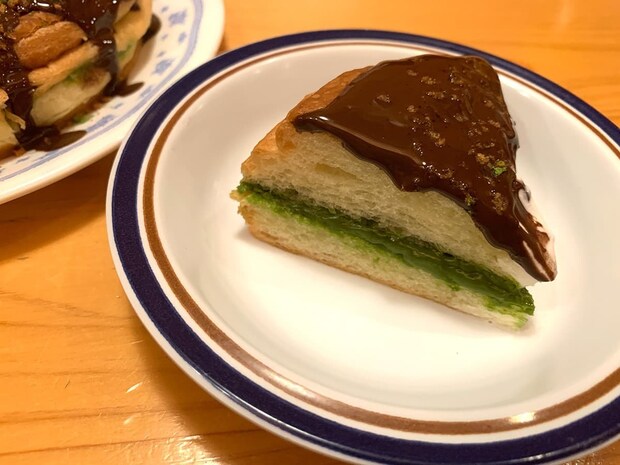 甘いチョコレートとバター感の強いデニッシュパンに、宇治抹茶のほろ苦さがスッと入り込むのも大きな魅力。チョコレートとデニッシュパンのみの組み合わせだと少々甘さが強い印象ですが、宇治抹茶が加わることで甘さをほど良くリセットしてくれます。