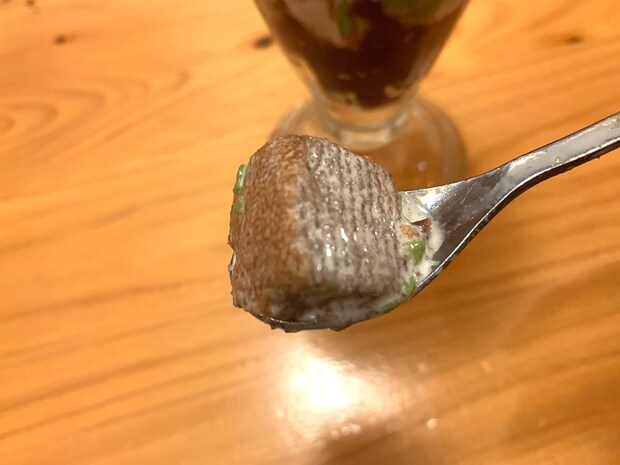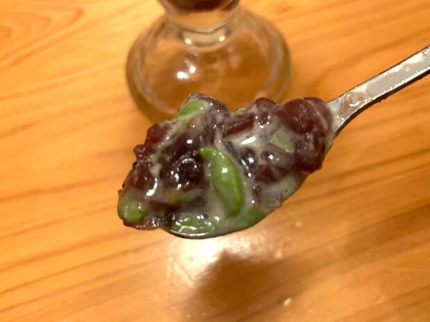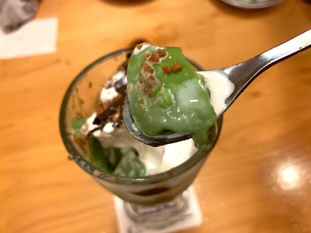 最後に、一番下にある小倉あんを宇治抹茶プリンとともに実食。宇治抹茶の風味と小倉あんのやさしい甘さが見事に調和しており、お互いの苦味と甘味を引き立て合っています。