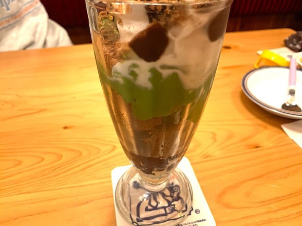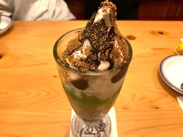 上から順番にクランチ・チョコソース・ソフトクリーム・宇治抹茶プリン・ココアバウムクーヘン・小倉あんを使用した贅沢感満載のデザート。一口ごとに異なる風味と食感が現れるパフェに仕上げられています!