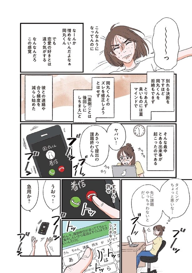 前回、かりんこが友達と飲んでいるとその場に岡丸くんが現れた。彼は大学近くのかりんこがいそうな居酒屋に目星をつけ、全て回って居場所を突き止めたと言うのだ。そんな彼との付き合いを友人からも反対される。彼氏の言動に引いていたかりんこに岡丸くんは…!?
