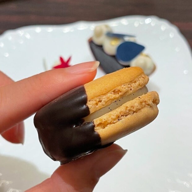 編集部が特に印象に残ったのが、こちらの「バニラマカロン」。バニラビーンズをたっぷり混ぜ込んだバニラクリームは甘く贅沢な香り。口溶けがよく、なめらかで何個でも食べたくなります。チョコレートのパリッとした食感がアクセントになっていますよ。