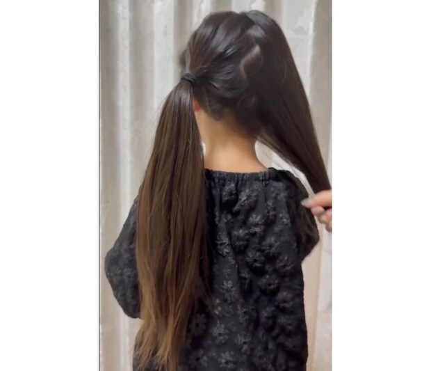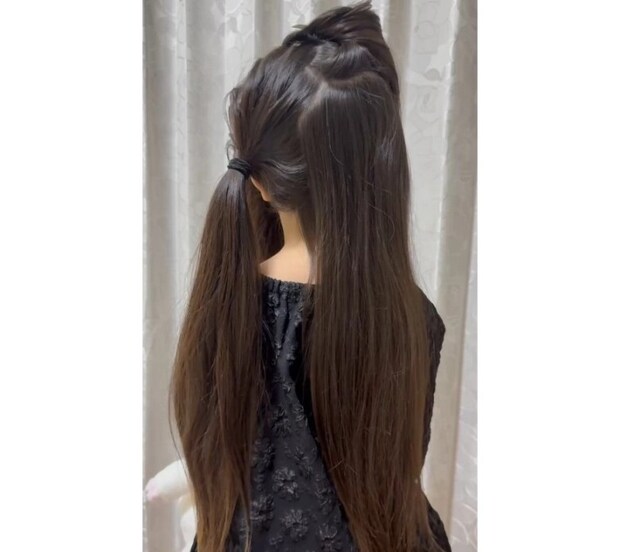 3. 仮留めしていないほうの髪を上下に分け、上半分を仮留めする