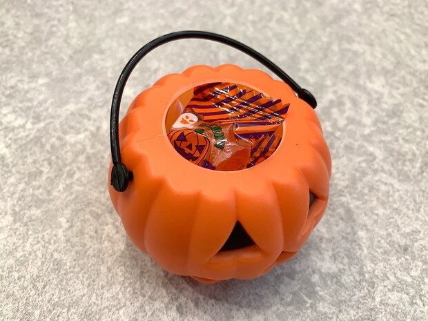 中は空洞になっていて、お菓子を入れることも可能。トリック・オア・トリートごっこにも使えます(容量は少なめ)。飾っても良し、お菓子入れにしても良し。