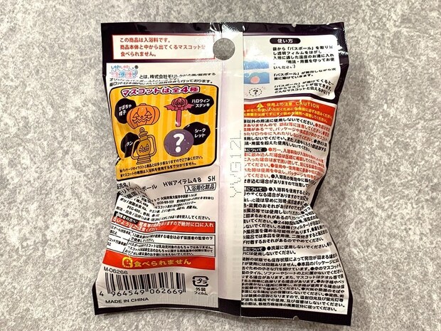 このバスボールを湯船に入れると、中からハロウィン仕様のマスコット(かぼちゃ帽子、ハロウィンステッキ、ランタン、またはシークレット)が一つ現れます。