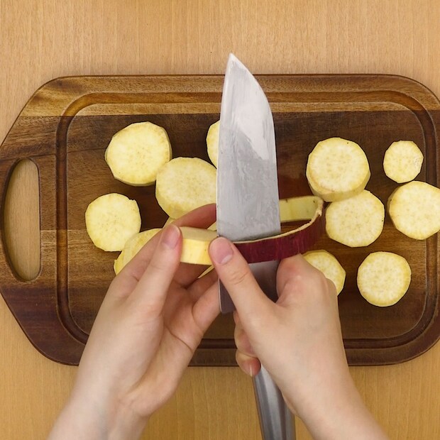 1. さつまいもは1cm幅に切り、厚めに皮をむく。水にさらして水気を切る。