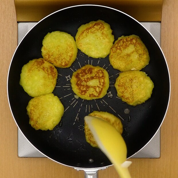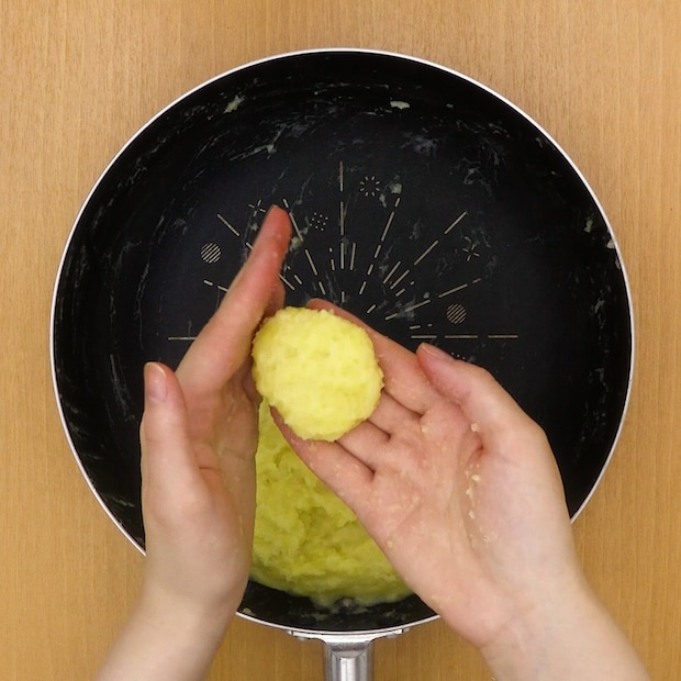 4. フライパンはさっと洗って水気をふきとる。フライパンに残りのバター(10g)を入れて中火で熱し、いももちを並べ入れる。両面に焼き色がつくまで焼く。