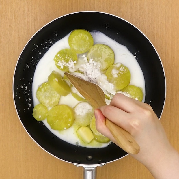 2.フライパンにさつまいも、さつまいもがかぶるくらいの水を入れて中火で熱し、わいたらさつまいもがやわらかくなるまで7〜8分ほどゆでる。水気を切ってフライパンに戻し入れ、半量のバター(10g)、片栗粉、砂糖、牛乳を加えてさつまいもがあたたかいうちになめらかになるまでつぶす。