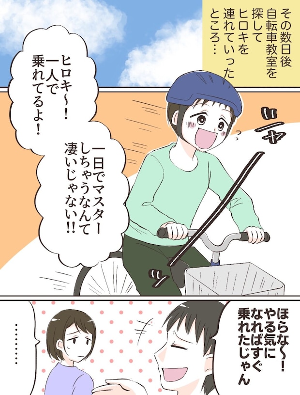 自分の息子なのだからできるはず、と信じてあげる気持ちは大切かもしれませんが、ショウヘイさんの言い方はヒロキくんのやる気をどんどん無くしてしまうようでしたね。自転車教室が見つかって良かったです!コツをしっかり教えてもらったらやり方が分かってやる気が出ますよね。