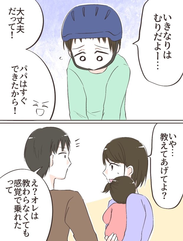 当時小1の息子ヒロキに自転車にそろそろ自転車を買おうと言う夫ショウヘイ。むしろなぜ持っていないのか不思議ですらある様子ですが、実は1年ほど前に自転車に乗る練習をさせていた妻キコに「無理強いするな。やる気になったら自分からやる」と止めたのはショウヘイでした。そのことを伝えると、ショウヘイは「俺は練習しなくても乗れたから乗れるはず」という持論を持ち出し、ヒロキに「乗りたいよな?」と言いました。気の進まなさそうなヒロキに「恥ずかしくないの?」と煽るショウヘイです。