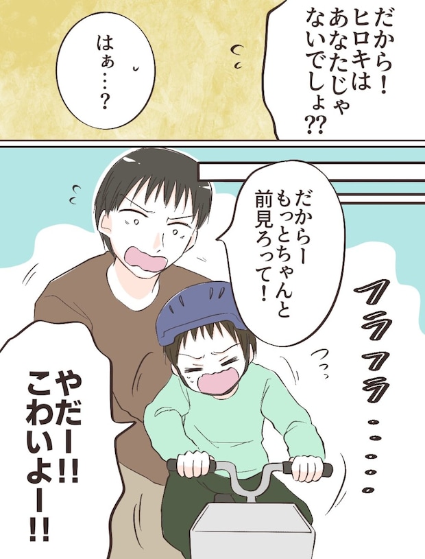 「だから!ヒロキはあなたじゃないでしょ?」つい語気が強まってしまいました。「はぁ?」とめんどくさそうに言っていたショウヘイでしたが、仕方なくヒロキを教えることに。「だからーもっとちゃんと前見ろって!」自転車にはまたがったものの怖がってフラフラするから余計に真っ直ぐこげないヒロキ。「やだー!こわいよー!」と半べそになるので、ショウヘイはだんだんイライラしていきました。