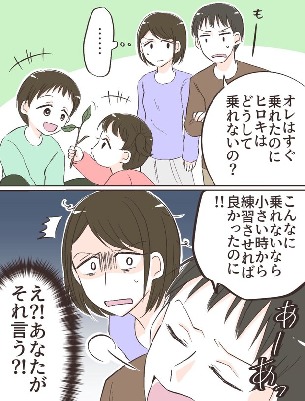 「オレはすぐ乗れたのにヒロキはどうして乗れないの?」呆れたようにショウヘイは言いました。ヒロキがどうして乗れないのか、よく見てどうすればいいか教えるとか、少しくらい寄り添ってあげたらいいのに。口に出したらケンカになるから言わなかったけれど、私は悶々とした気持ちになっていました。「こんなに乗れないなら小さい時から練習させれば良かったのに!」と吐き捨てるように言ったショウヘイに、あなたが言う!?と思うとともに、あの時ショウヘイの言うことなんて聞かずに、もう少しヒロキに寄り添って練習させてあげればよかったなという公開もチラリと頭をよぎりました。