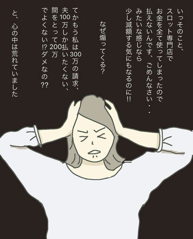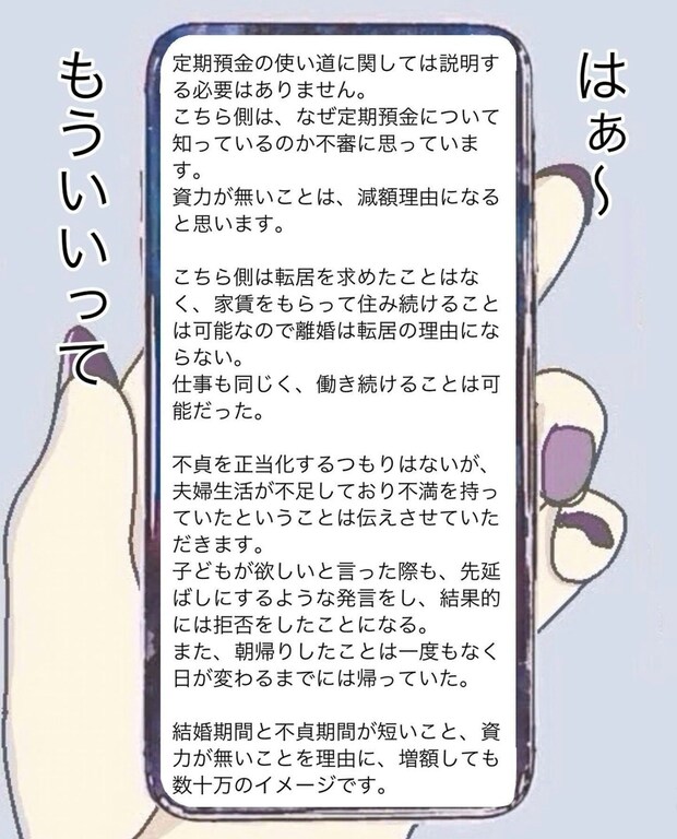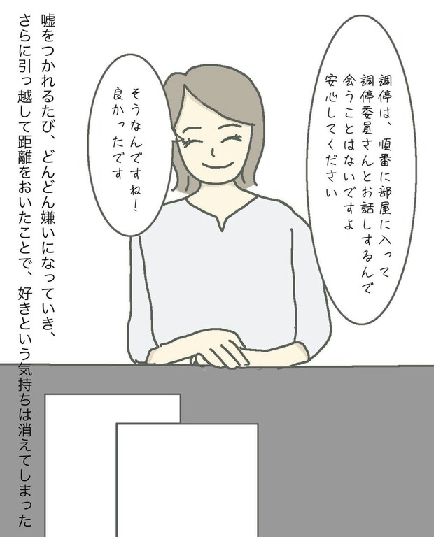 まりも夫婦は夫の親族が住まなくなった家を借りて住んでいたため、離婚に際しまりもはその家を引越すことに。お互いに弁護士を立てて双方の希望をすり合わせていましたが、まりもの希望する慰謝料300万円を夫は受諾せず、100万円程度に引き下げるよう要求をしてきました。