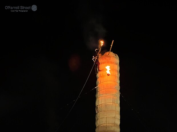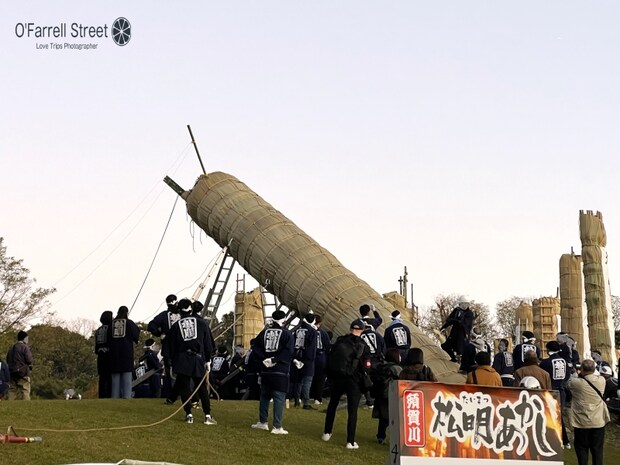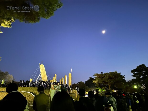 五老山に到着した高さ10m、重さ3tもの松明を、1時間近くかけて、すべて人力で少しずつ立ち上げていく様は手に汗握る迫力で、見ている観客ともども、いつしか一体感に包まれてゆくのです。今の時代であればクレーンを使い、あっという間に立ち上げられるものを、敢えて人力にこだわり、呼吸を合わせ、命の危険と隣り合わせの行事に取り組む様子は一つのドラマを見ているようで胸が熱くなります。