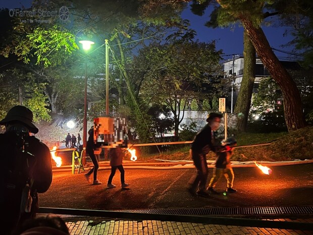 この松明あかしは、地域の結束や伝統文化の継承の雰囲気も濃いようで、地元の企業や中学校、町内会をあげて参加されています。この時間帯になると、観客も増え五老山への入山もすでに規制されていました。