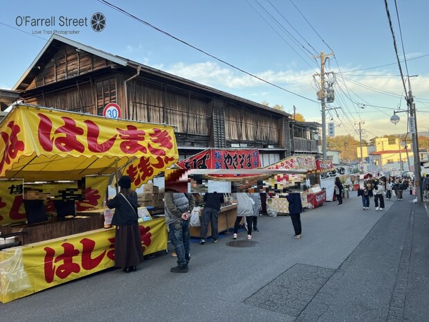 松明が運び入れられ、夕方になると山の麓も長蛇の列となり入山規制も始まります。飲食できるような状態ではないので、飲食は事前に済ませておくか、終了してからになります。飲食スポットは、五老山の麓にある芝生広場でキッチンカーなどのフードコートが設営されていますし、町中ならカフェや蕎麦店などもありますが軒数としては少なめです。夜店も出店されていて大変盛り上がりますが、終盤になると長蛇の列になるので早めの購入がカギですね。
