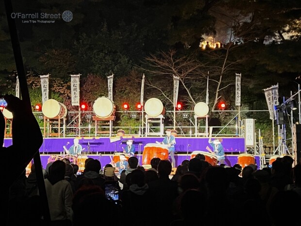 18時を過ぎると五老山の麓で松明太鼓の演奏も始まり、松明点火に向けて雰囲気が一気に盛り上がってまいります。18時半を過ぎると二階堂神社から奉受された御神火(ごじんか)が、順次松明に点火されてゆきます。