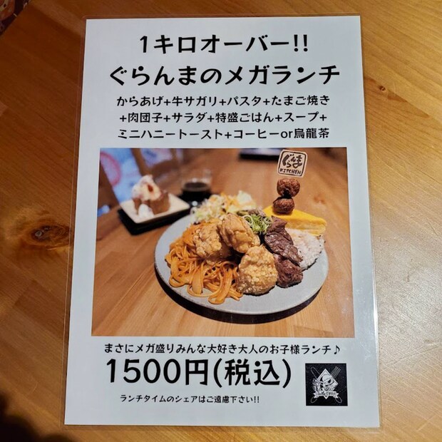 しかし今回は、ぐらんま人気メニューのいいとこどりで、「大人のお子様ランチ」というキャッチコピー通り、味・量・コスパの三拍子が揃っていると話題の、「メガランチ」を注文しました。ちなみに、こちらのメガランチは複数人でシェアすることが「NG」となっているのでご注意を。