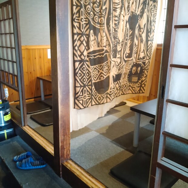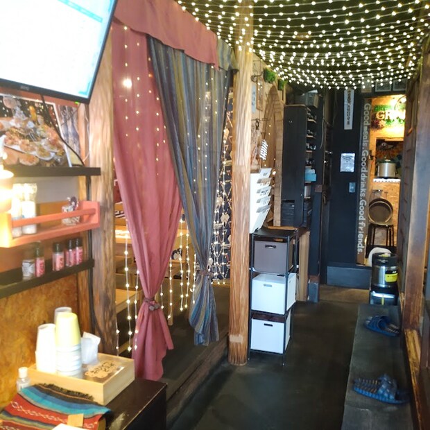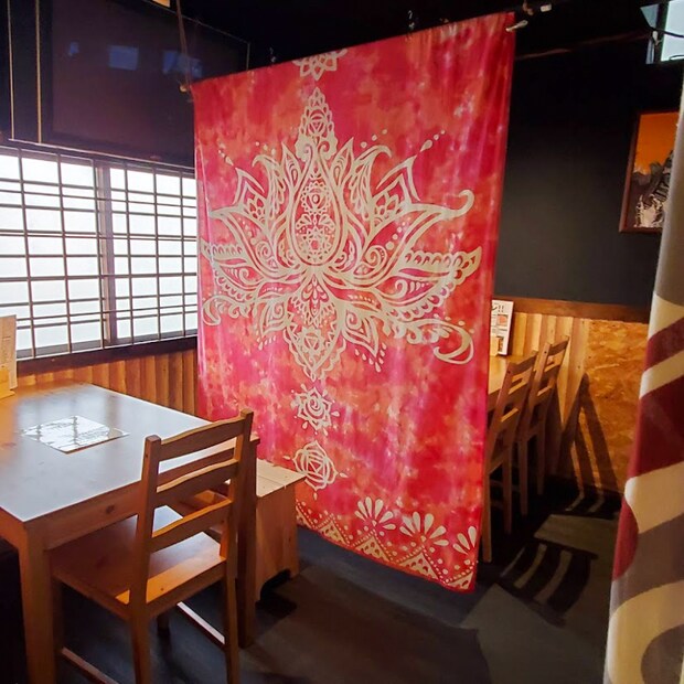 店内1階には小あがりの座敷席とテーブル席が数席ずつあり、いずれもどこかエスニックでアジアンテイストな暖色系のドレープカーテンで仕切られています。