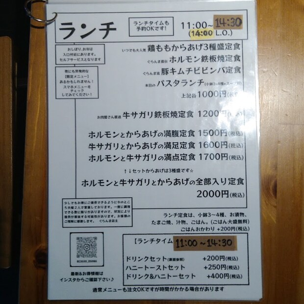 そんな「異空間居酒屋」と呼ぶべきぐらんまのランチメニューがこちらで、ホルモン鉄板焼定食や、絶品だと評判のパスタランチも気になります。