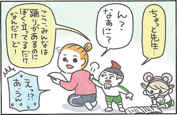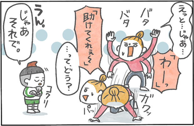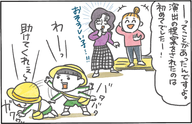 園の発表会で初めて劇をやることになった4歳の男の子。「おむすびころりん」の“よくばりじいさん”役だった男の子は、とあるシーンにアクションを追加したいと希望したのだとか。先生が提案したセリフと動きに納得している姿は、まるで大御所俳優のようですね(笑)。 子どもの自由な発想とユニークな視点、それを受け止めてくれる先生も微笑ましい体験談です。きっと、いい劇になったことでしょう!