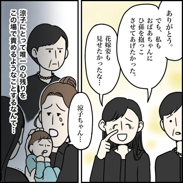 すると、「ひろみはひ孫の顔を見せられてほんと祖母孝行よね~。お母さんもうれしかったと思うわ」「それがいちばんよね」と涼子に向かって嫌味を言う義姉たち。