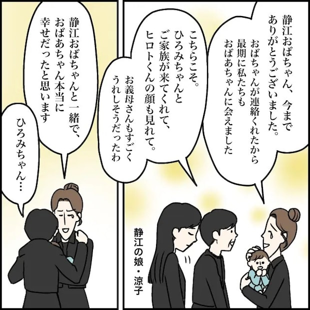 その後、「静江おばちゃん、今までありがとうございました。おばちゃんが連絡くれたから、最期に私たちもおばあちゃんに会えました」ひろみちゃんが私と涼子に挨拶してくれ、「こちらこそ。ひろみちゃんとご家族が来てくれて、ヒロトくんの顔も見られて。お義母さんもすごくうれしそうだったわ」と言うと、「静江おばちゃんと一緒で、おばあちゃん本当に幸せだったと思います」ひろみちゃんの言葉に「ひろみちゃん・・」そう言いながら涙が溢れました。