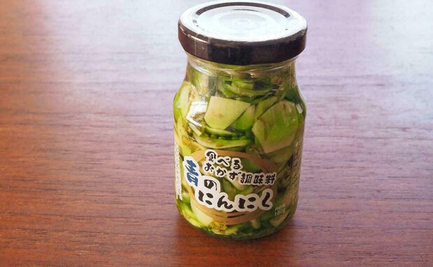 業務スーパーで話題の「食べるおかず調味料シリーズ」の一品、「青のにんにく」。にんにく、わさび葉、青唐辛子をラー油漬けにした、ご飯のお供に最適な調味料です。