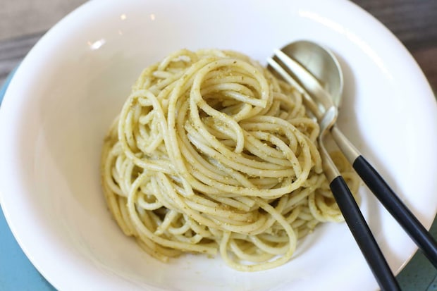最も簡単な使い方は、茹でたパスタに大さじ2杯程度を混ぜるだけで完成するジェノベーゼパスタ。温める必要もなく、非常に手軽です。